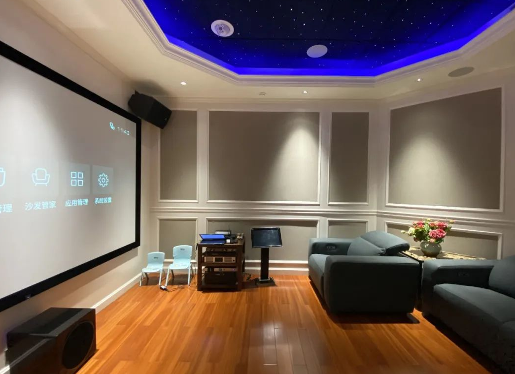 觀影模式:按一下觀影模式,影音室的所有燈光會先打開讓家人入座,隨后除了星空燈外其余的慢慢關閉。于此同時,投影機、所有功放、媒體播放機、硬盤播放機、機頂盒、矩陣等機房內眾多設備都會逐個自動打開,直接進入選片狀態。